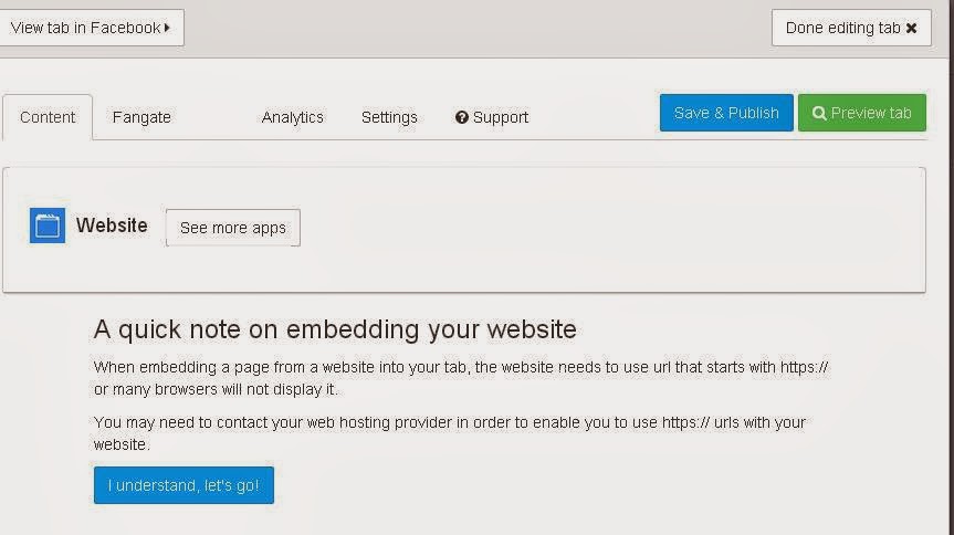 Click on "I Understand , lets go" option to continue when you are embedding your website as a landing page tab in Facebook fan page